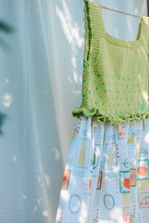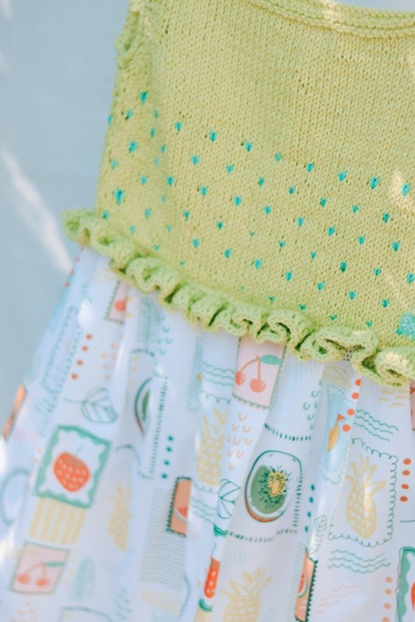 La parte inferior esta realizada en batista estampada con estampitas y frutas exclusiva de Dede y tiene tablitas que generan movimiento y amplitud, haciendo un vestido sumamente cómodo y fresquito.