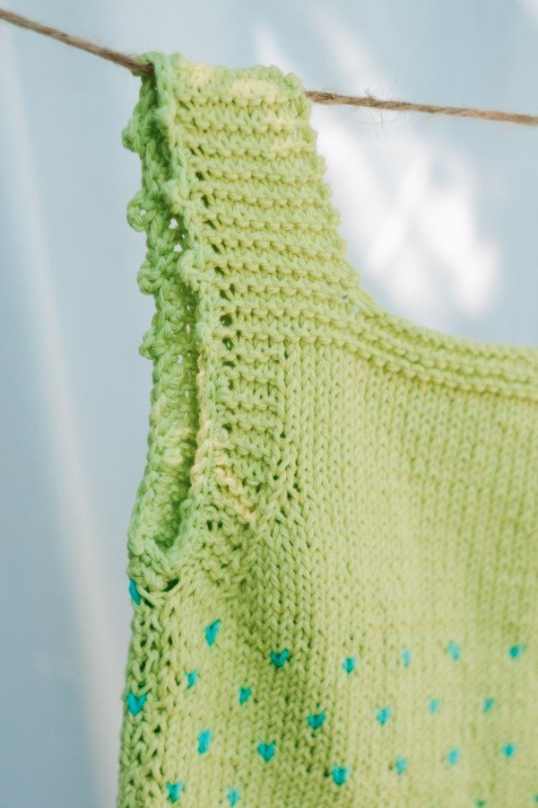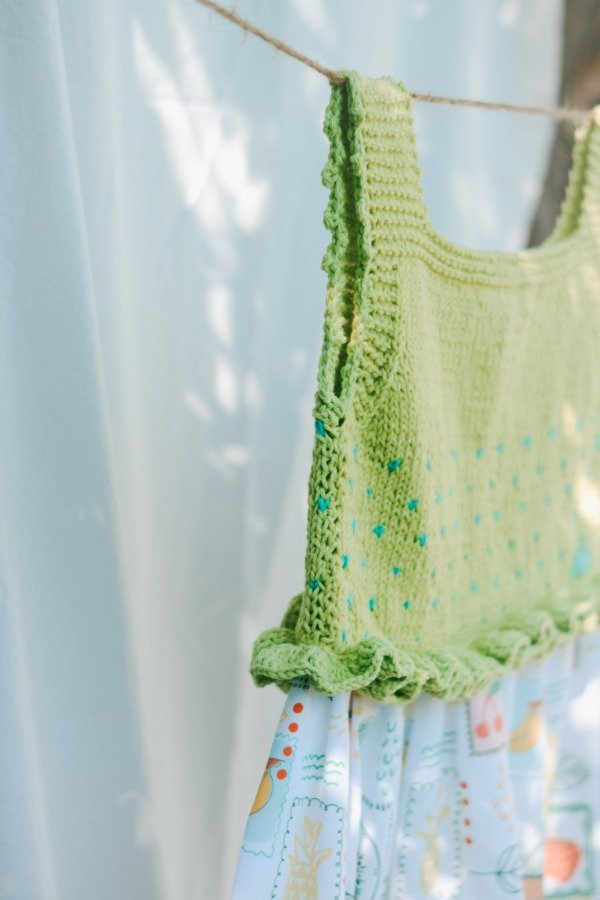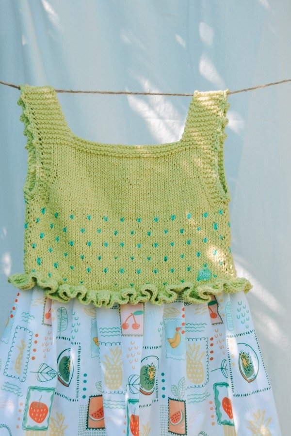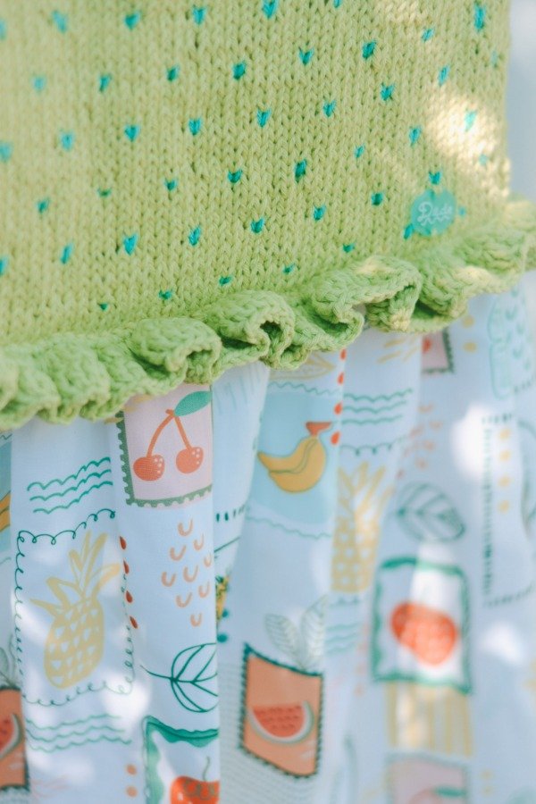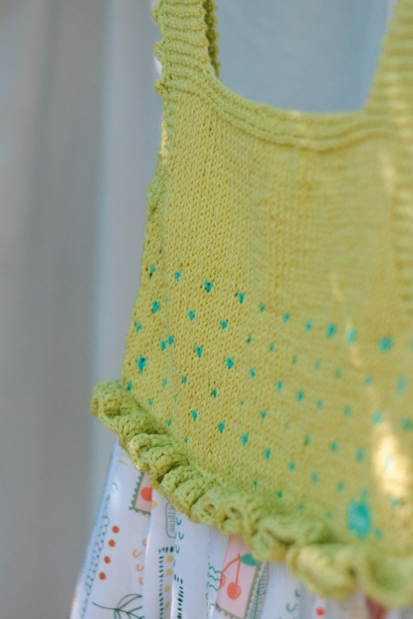La parte superior esta tejida a mano con dibujos de pintitas y tiene un volado en toda su circunferencia tejido a crochet.