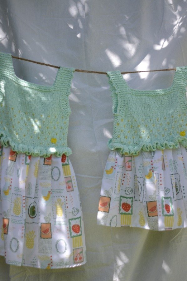 La parte inferior esta realizada en batista estampada con estampitas y frutas exclusiva de Dede y tiene tablitas que generan movimiento y amplitud, haciendo un vestido sumamente cómodo y fresquito.