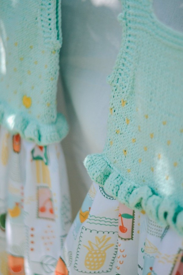 La parte superior esta tejida a mano con dibujos de pintitas y tiene un volado en toda su circunferencia tejido a crochet.