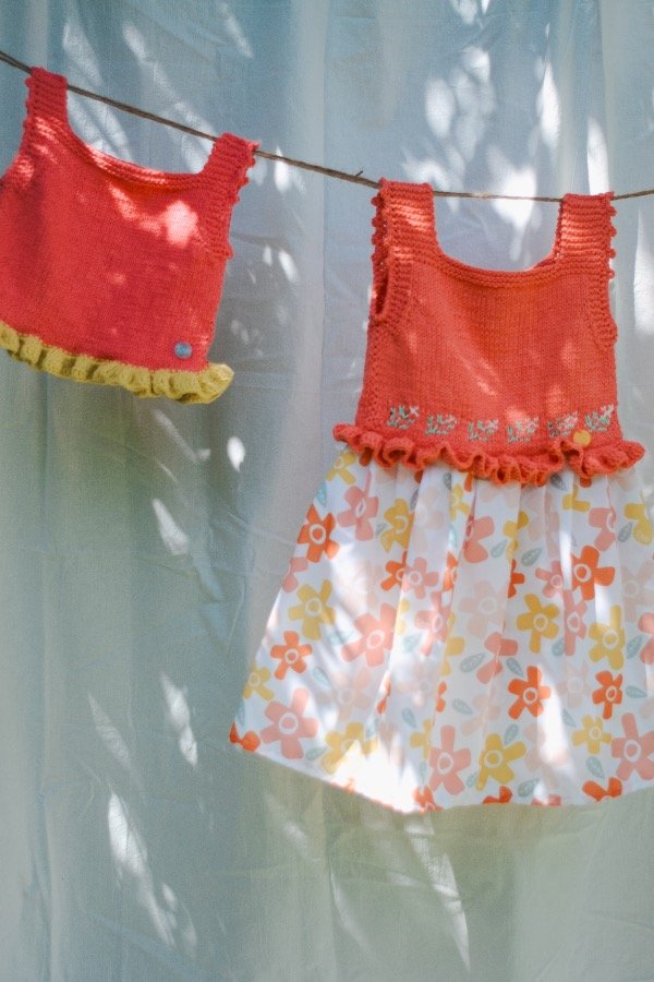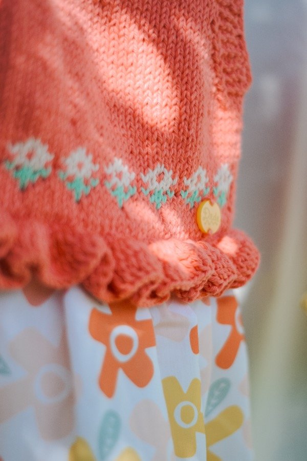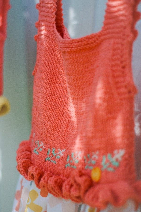 La parte superior esta tejida a mano con dibujos de pintitas y tiene un volado en toda su circunferencia tejido a crochet.