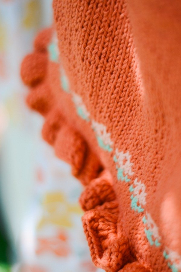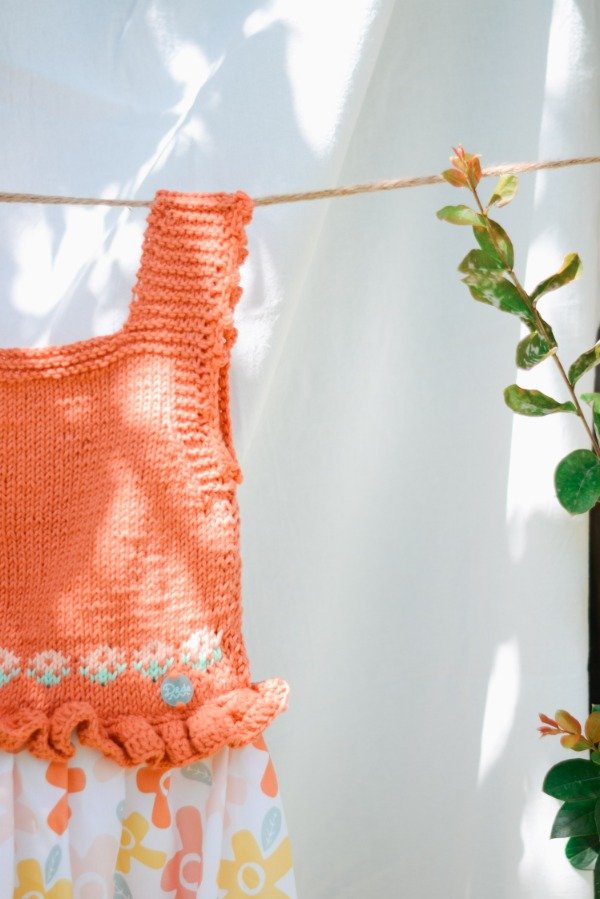 La parte superior esta tejida a mano con dibujos de pintitas y tiene un volado en toda su circunferencia tejido a crochet.