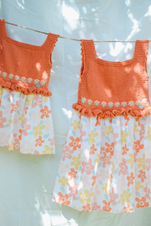 La parte inferior esta realizada en batista estampada con flores de malvón en fondo color natural, exclusiva de Dede y tiene tablitas que generan movimiento y amplitud, haciendo un vestido sumamente cómodo y fresquito.
