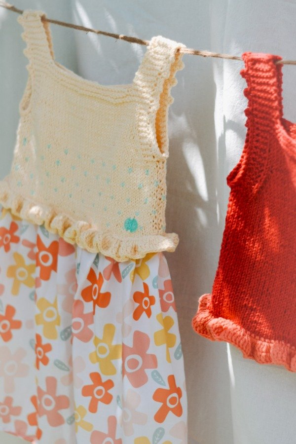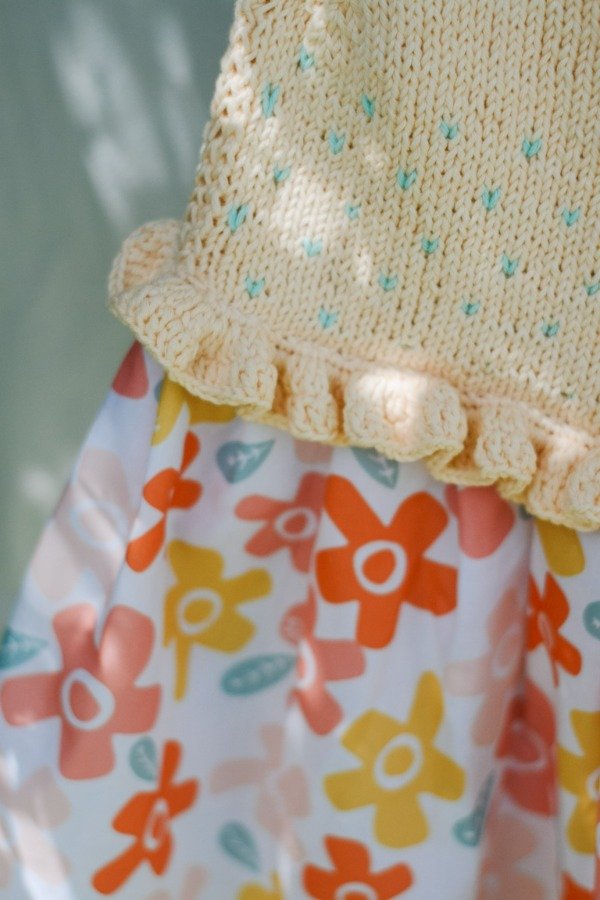 La parte superior esta tejida a mano con dibujos de pintitas y tiene un volado en toda su circunferencia tejido a crochet.
