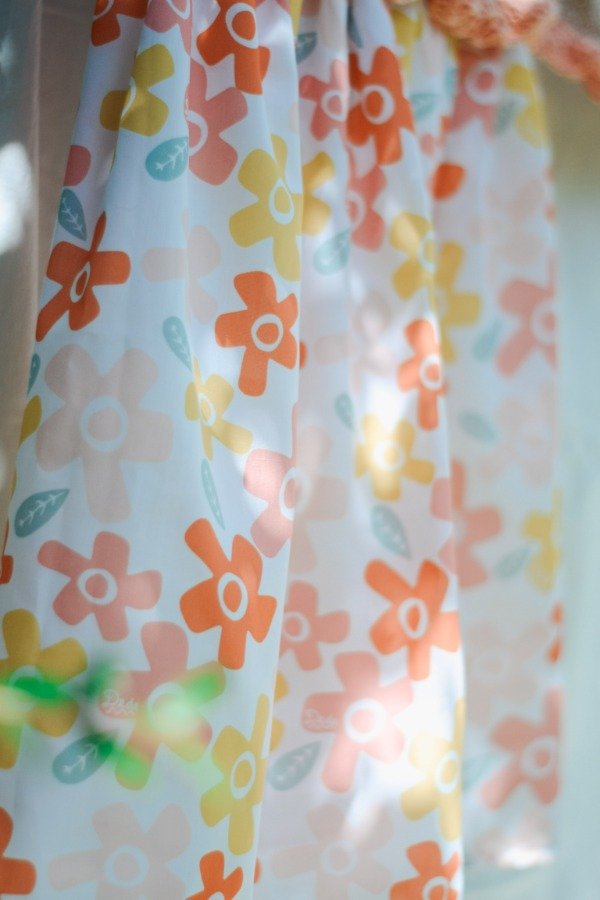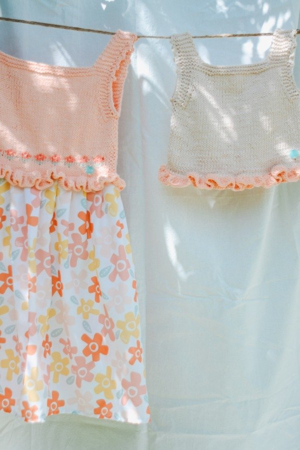 La parte inferior esta realizada en batista estampada con flores de malvón en fondo color natural, exclusiva de Dede y tiene tablitas que generan movimiento y amplitud, haciendo un vestido sumamente cómodo y fresquito.