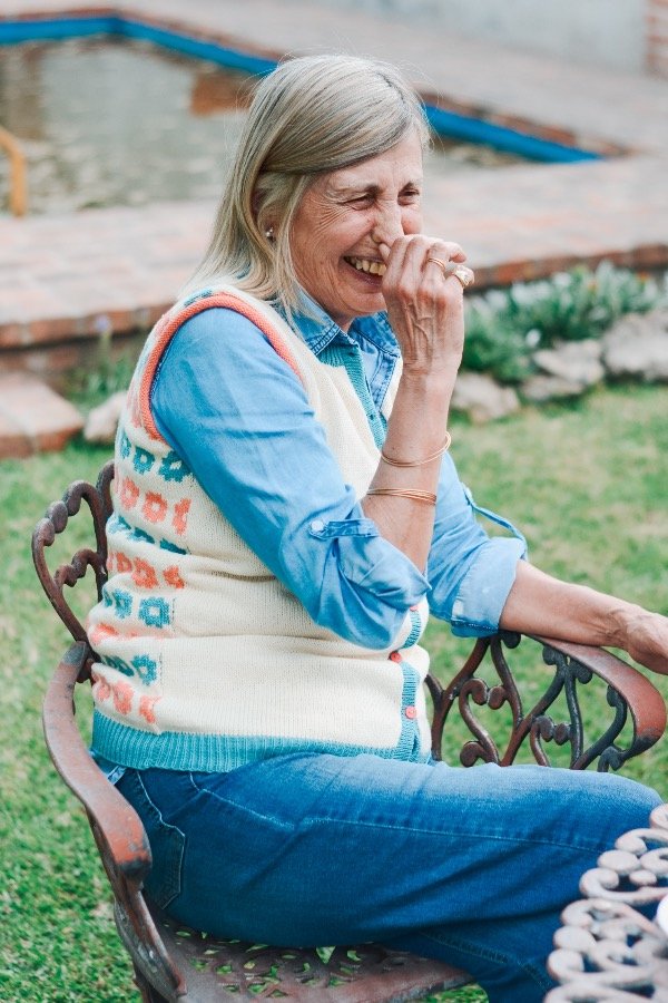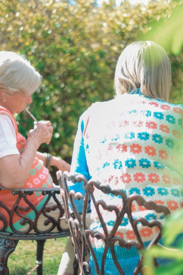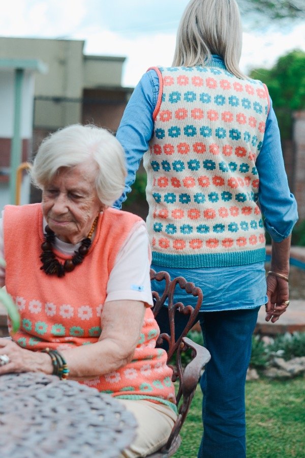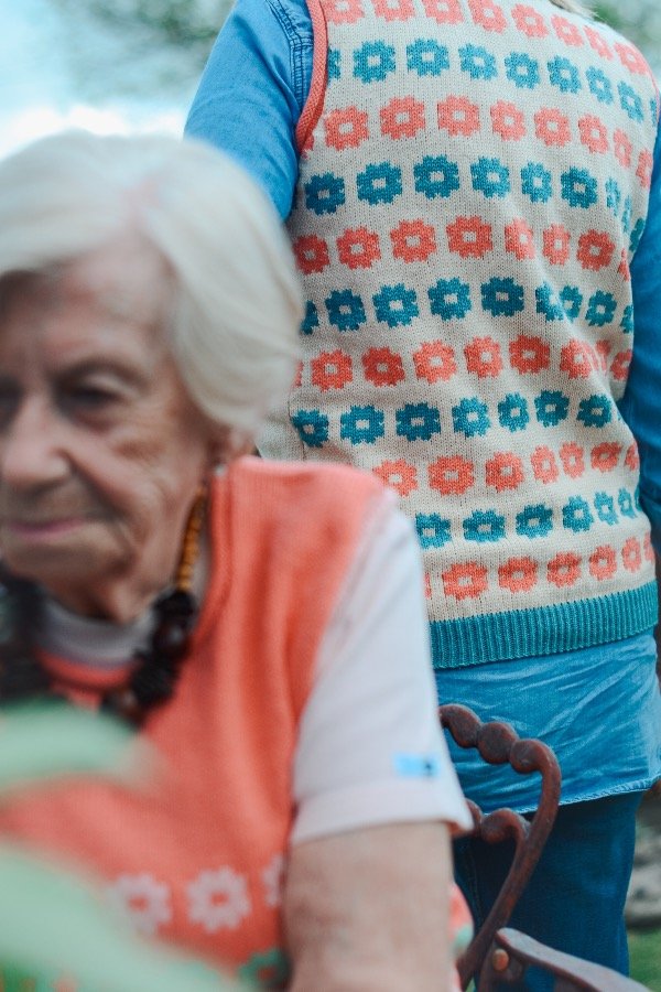 Esta versión es abotonada en la delantera y la espalda esta tejida con guardas de flores de malvones. Que son realizadas con la técnica jacquard.
