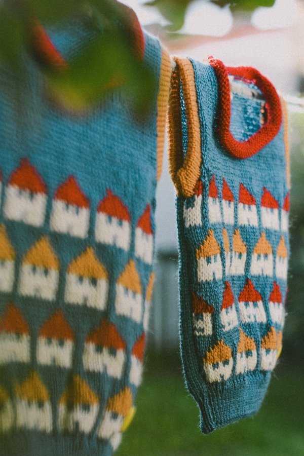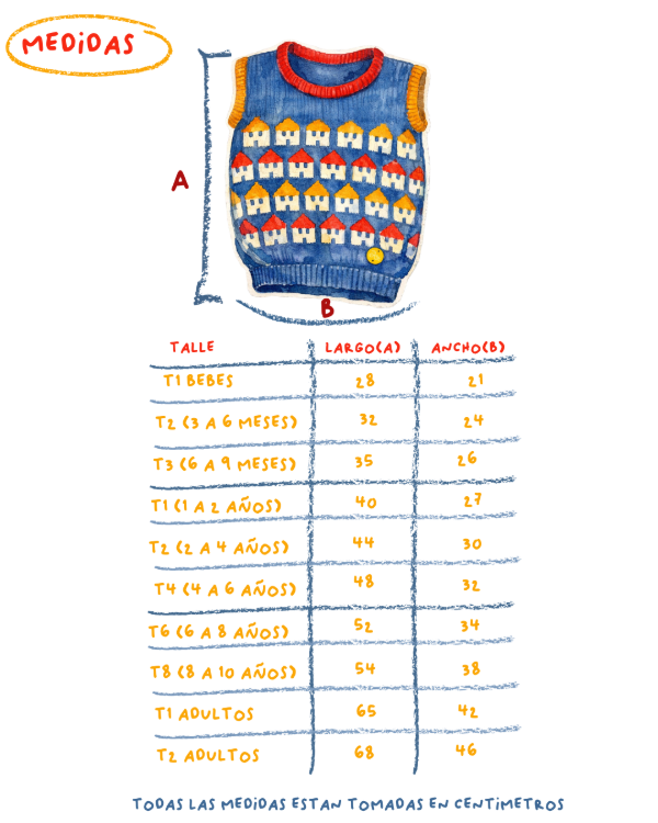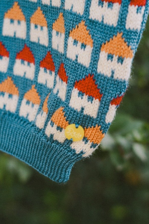 Lo tejimos con guardas de casitas de techos naranja y rojo, sobre un fondo azul, generando un contraste hermoso y divertido.