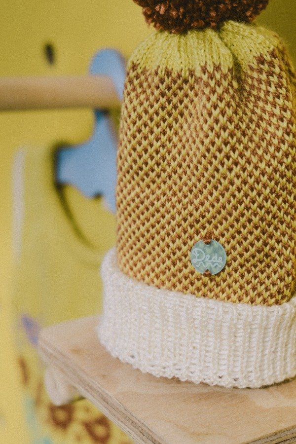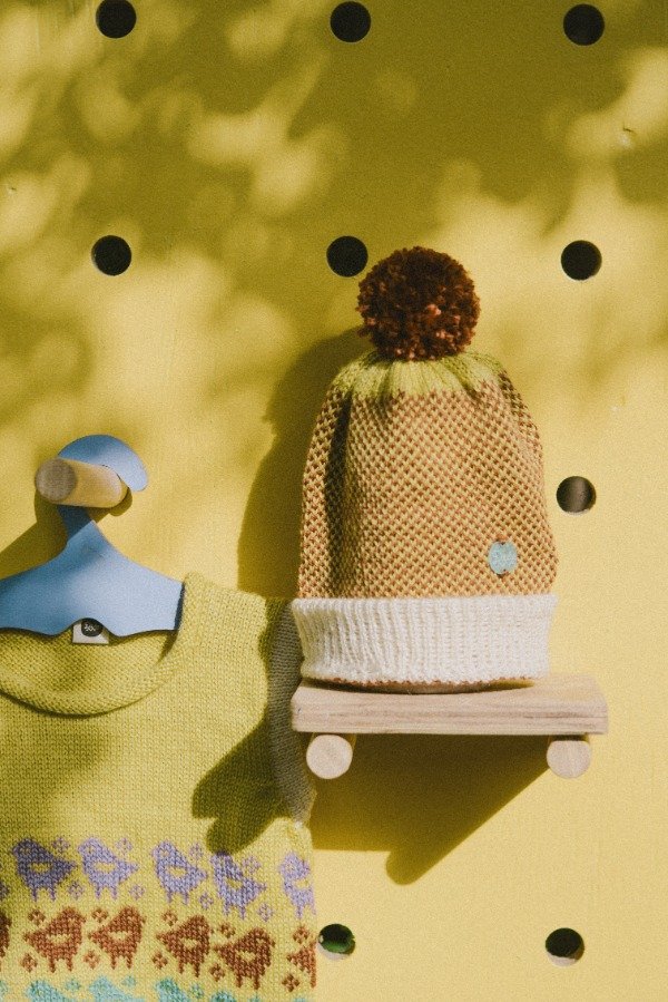 Gorritos tejidos a maquina manual formando una trama de pintitas amarillas y marrones.