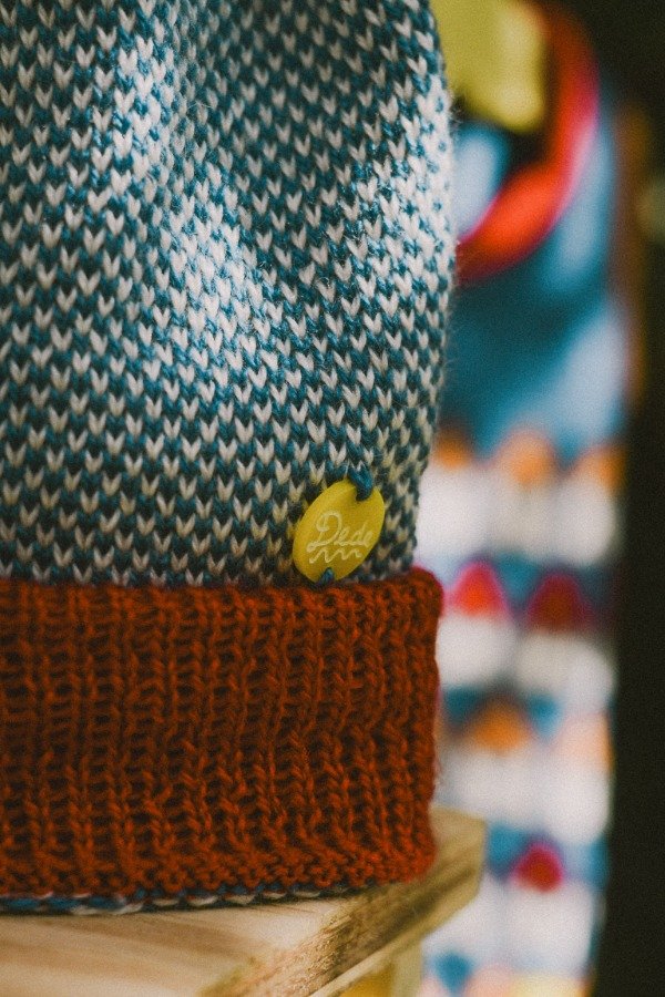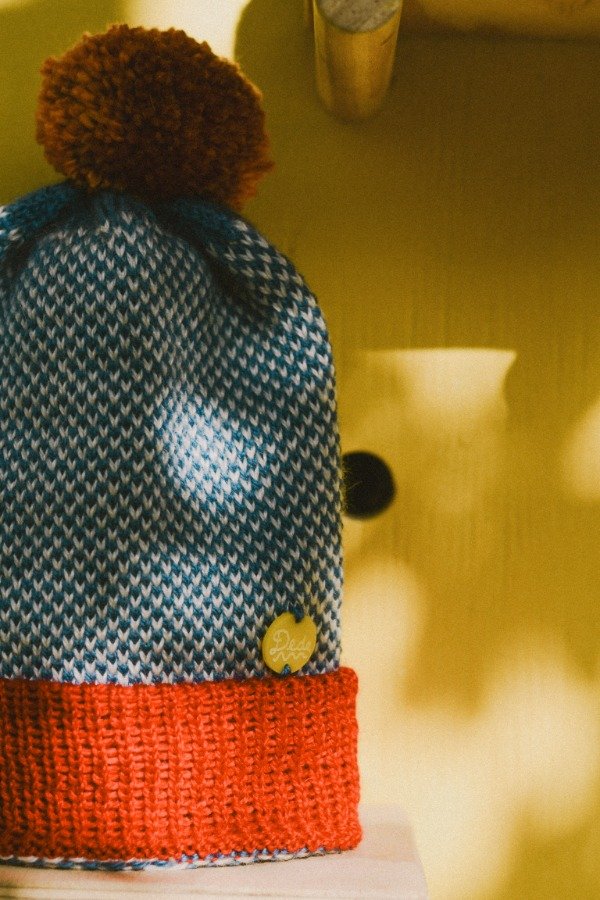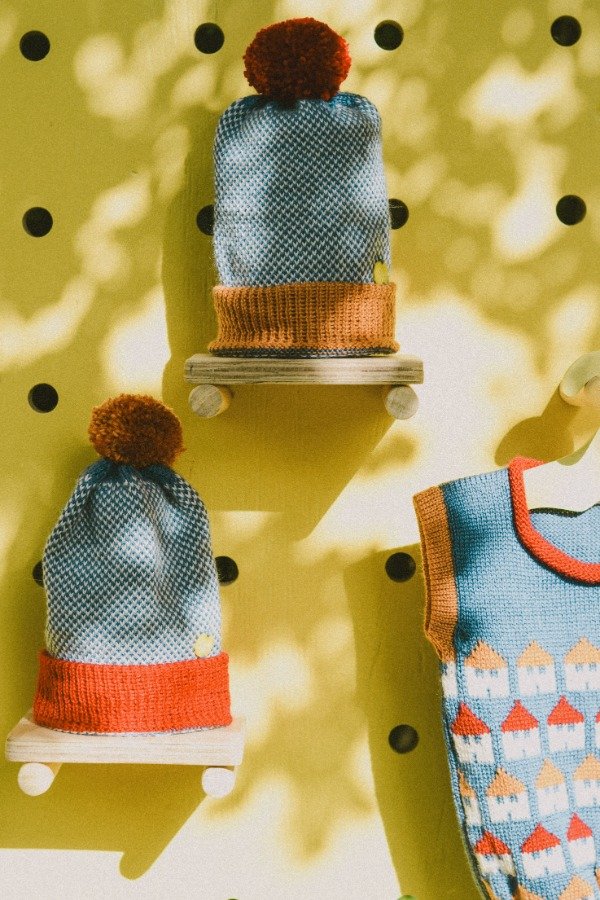 Es un gorrito geométrico, alegre y lúdico. Y queda perfecto con el Chaleco Barrio Azul.