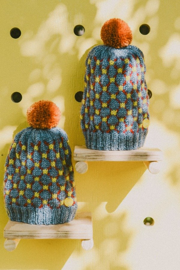 Gorritos tejidos a mano formando un entramado de rombos.