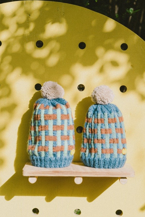 Gorritos tejidos a mano formando un entramado de lineas que forman una especie de cuadricula.