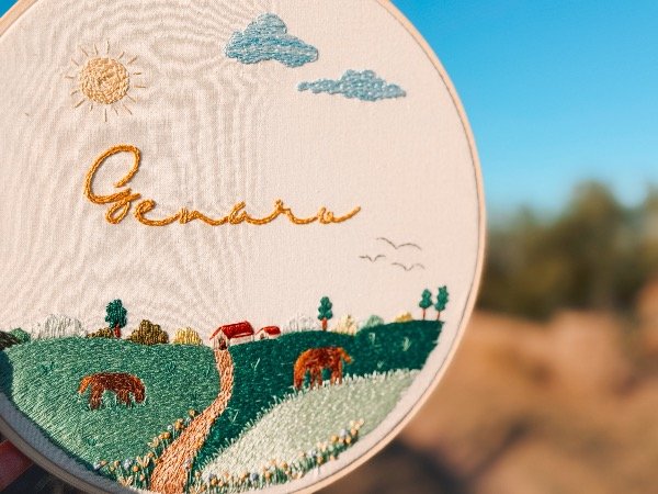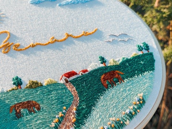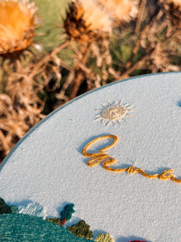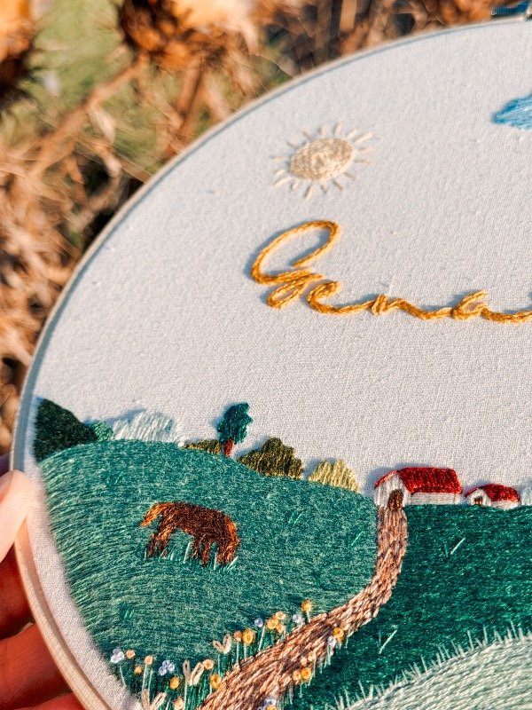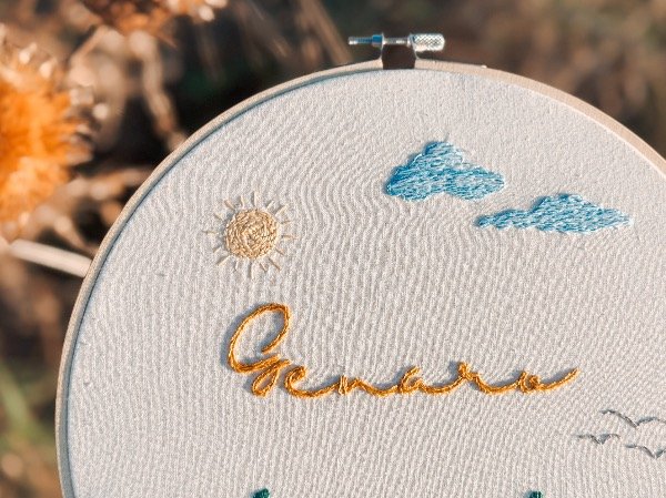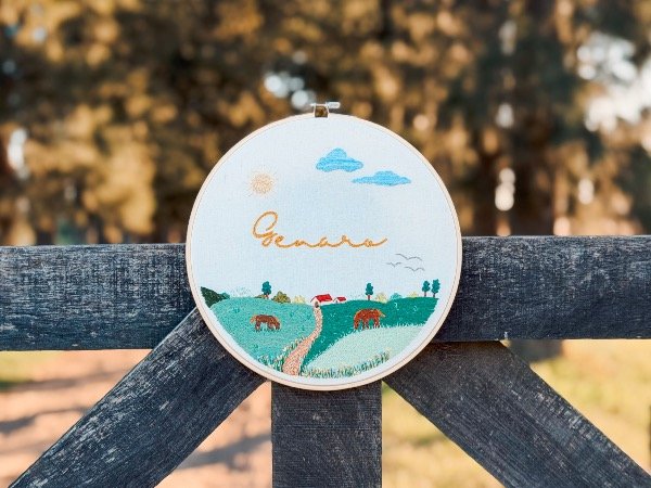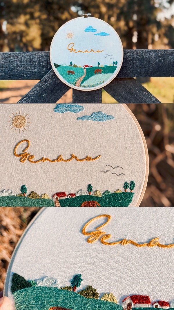 Cuadrito bordados a mano en bastidor de bambú de 23cm de diámetro, sobre tusor de algodón.