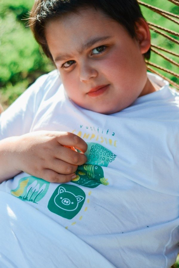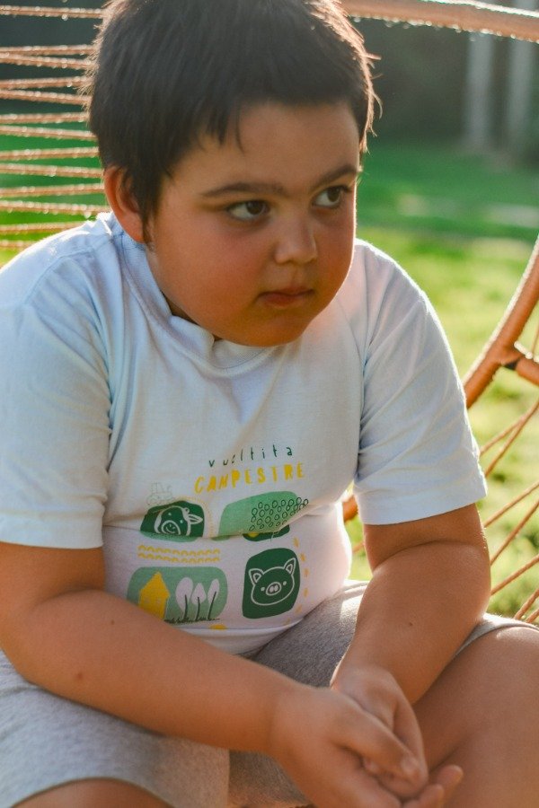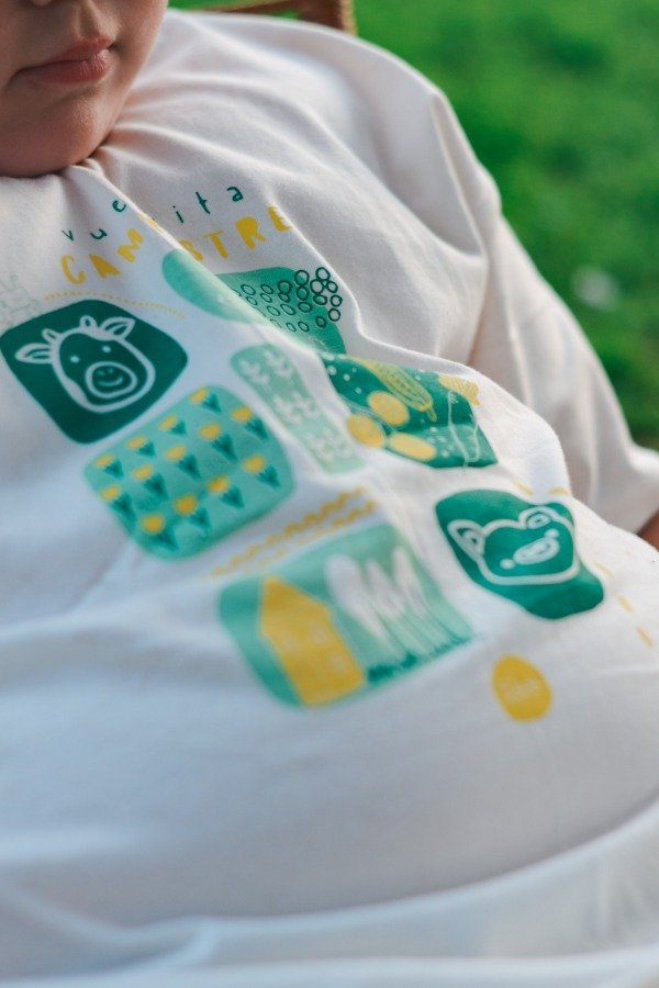La estampa es un dibujo exclusivo de Dede que simboliza las parcelas campestres, sus siembras, sus florcitas y sus animalitos. Y se estamparon una a una mediante la técnica de la serigrafia. Esta estampa tiene tres colores, se fue estampando en capas hasta lograr el resultado final.