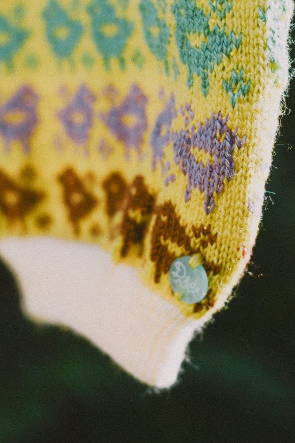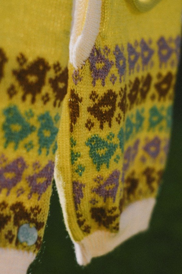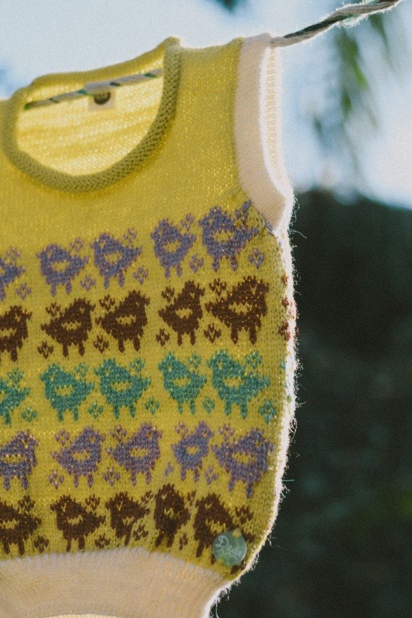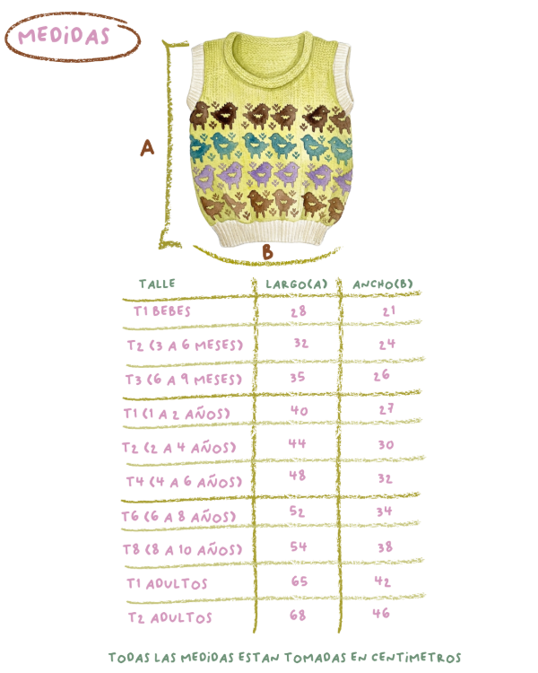 Lo tejimos con guardas de pajaritos en colores chocolate, lila y verde azulado sobre un fondo amarillo pastel, generando un chaleco dulce, calmo y alegre.
