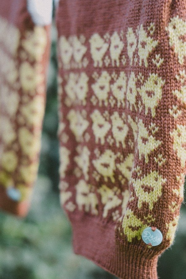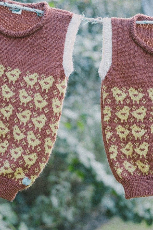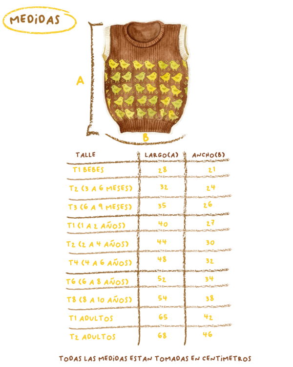 Lo tejimos con guardas de pajaritos en color amarillo limón sobre un fondo chocolate, generando un contraste hermoso.